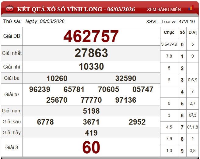 Kết quả xổ số Vĩnh Long Thứ Sáu ngày 6/3/2026