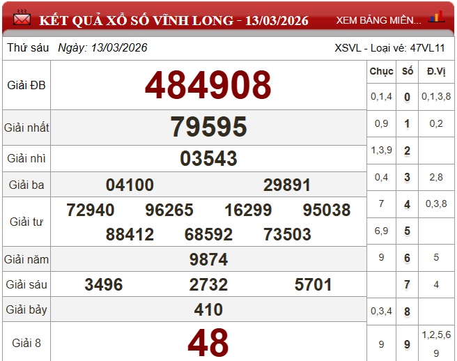 Kết quả xổ số Vĩnh Long Thứ Sáu ngày 13/3/2026