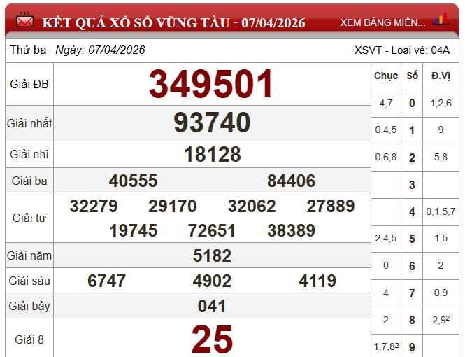 Kết quả xổ số Vũng Tàu ngày 7/4/2026