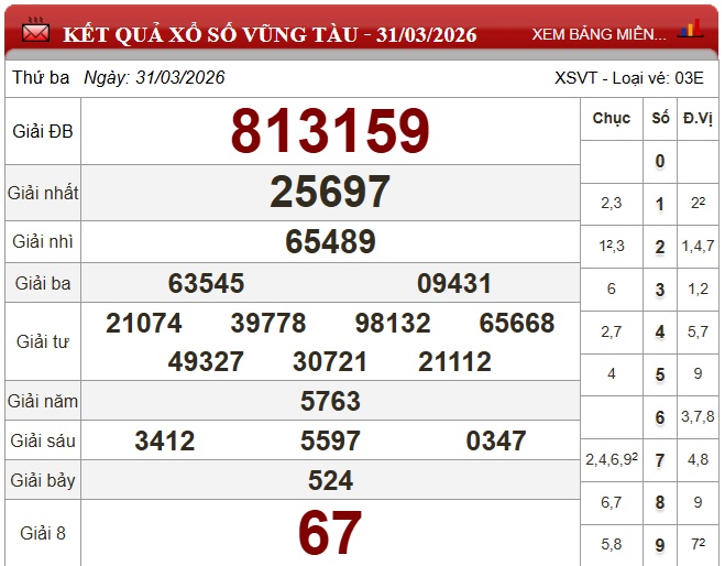 Kết quả xổ số Vũng Tàu Thứ Ba ngày 31/3/2026