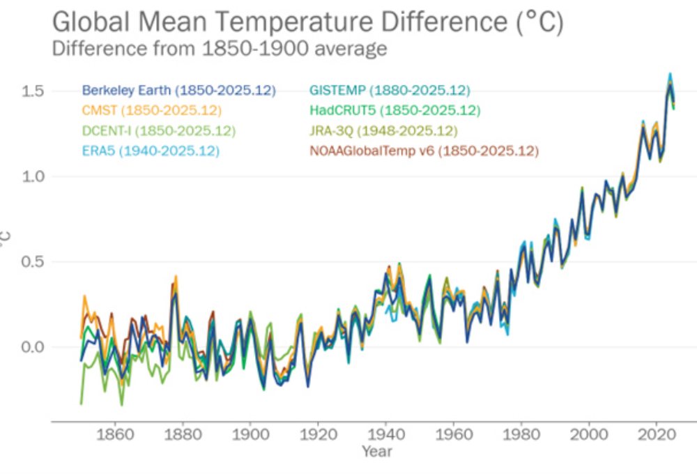 Sau khi tổng hợp và phân tích 8 bộ dữ liệu khí hậu quốc tế, WMO cho biết nhiệt độ bề mặt trung bình toàn cầu năm 2025 cao hơn khoảng 1,44 độ C so với mức trung bình thời kỳ tiền công nghiệp (1850-1900). Sáu bộ dữ liệu, trong đó có của Trung tâm Dự báo Thời tiết hạn trung châu Âu (ECMWF) và Cơ quan Khí tượng Vương quốc Anh, xếp năm 2025 là năm nóng thứ 3 trong lịch sử quan trắc 176 năm, trong khi 2 bộ dữ liệu còn lại xếp ở vị trí thứ 2. Cơ quan Quản lý Khí quyển và Đại dương Quốc gia Mỹ (NOAA) cũng xác nhận năm 2025 là năm nóng thứ 3 trong chuỗi dữ liệu toàn cầu của mình, bắt đầu từ năm 1850.