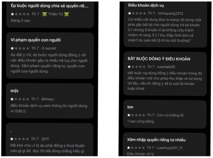 Phần lớn người dùng đánh giá 1 sao cho Zalo vì cho rằng ứng dụng này đang ép buộc người dùng với những điều khoản phải cung cấp thông tin cá nhân trong khi nền tảng lại không chịu trách nhiệm nếu thông tin bị lộ lọt.
