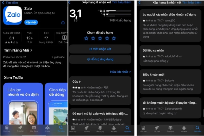 Theo ghi nhận của phóng viên, trên kho ứng dụng App store những ngày qua, ứng dụng Zalo liên tục bị nhận đánh giá 1 sao. Cùng với đó, người dùng cũng thể hiện sự bức xúc thông qua những bình luận như “Ép buộc người dùng chia sẻ quyền riêng tư”, “Vi phạm quyền con người”, “Xâm nhập quyền riêng tư nhiều”….